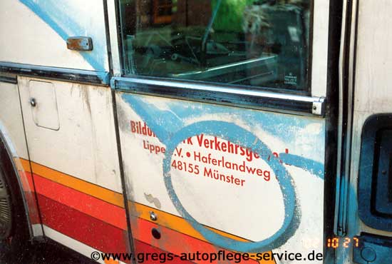 Respekt vor diesem Schadensfall flößte uns nicht die Schwere der Verunreinigung oder die Summe der unterschiedlichen Materialien ein, sondern in erster Linie beunruhigte uns das Alter der verunreinigten Oberflächen und die Dimensionen eines so großen Fahrzeugs. Nach einer gründlichen Wäsche zeigte sich, dass die Beaufschlagung noch schlimmer war als zunächst angenommen. Unter der Schmutzschicht wurde ein feiner Sprühnebel sichtbar, der sich über die gesamte Seite und Front des Busses zog.