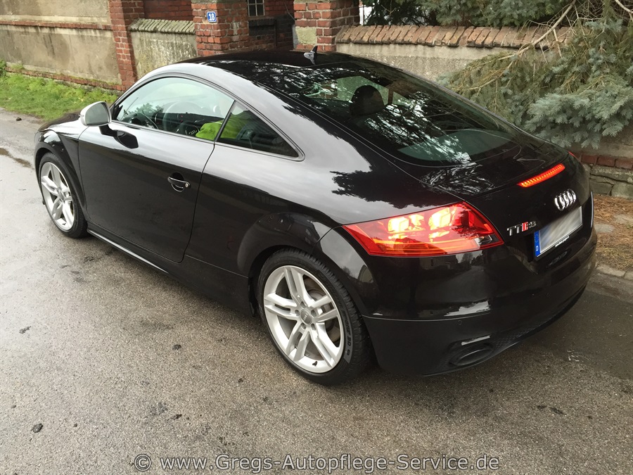Mit gerade mal 21.158 km "auf der Uhr" - gilt dieser AUDI TT RS eindeutig noch als junges Fahrzeug. Dennoch überprüfen unsere Techniker vor Arbeitsbeginn bzw. bei Abholung des Autos die Oberflächen auf Beschädigungen. Auch in diesem Fall waren neben Gebrauchsspuren leichte Schäden an zwei Felgen erkennbar; Stoßfänger vorne sowie Kotflügel rechts vorne wiesen eine Stauchung auf und ein dicker Klecks, der als Baumharz zu identifizieren war, "verschönerte" das hintere Seitenteil (für Beispielaufnahmen bitte hier klicken).
