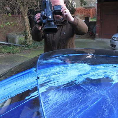 Es ist nicht die blaue Eingangstür, die sich hier im Autodach und in den Fahrzeugscheiben spiegelt … Leider nicht! Zur Vergrößerung bitte auf das Bild klicken.